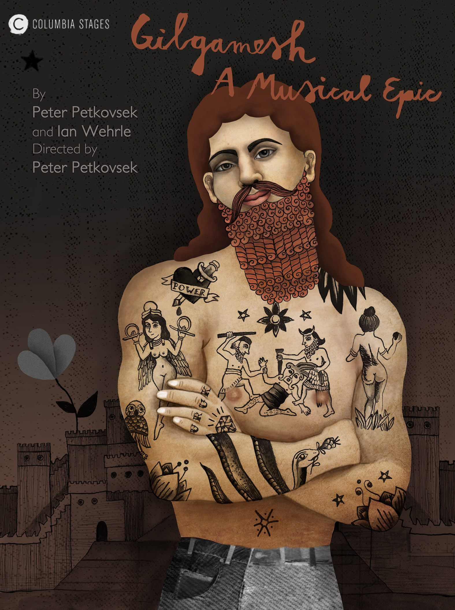 Artwork for a theatre play Gilgamesh: A Musical Epic, Columbia Stages, 2015. Based on the epic from Mesopotamia, one of the oldest pieces of literature known to us today, Gilgamesh - A Musical Epic is a story of how Man went from Animal to God, told in the form of an epic rock opera with a live band. Created by Ian Wehrle (Music) and Peter Petkovsek (Book, Lyrics), this new musical follows the Mesopotamian hero-king Gilgamesh on his quest to become immortal. Gilgamesh was an historic Sumerian king who hovered on the border between history and myth. Soon after his death his feats were turned into legend and a millenium later amassed into the standard (Babylonian) version of the Epic as we know it today.