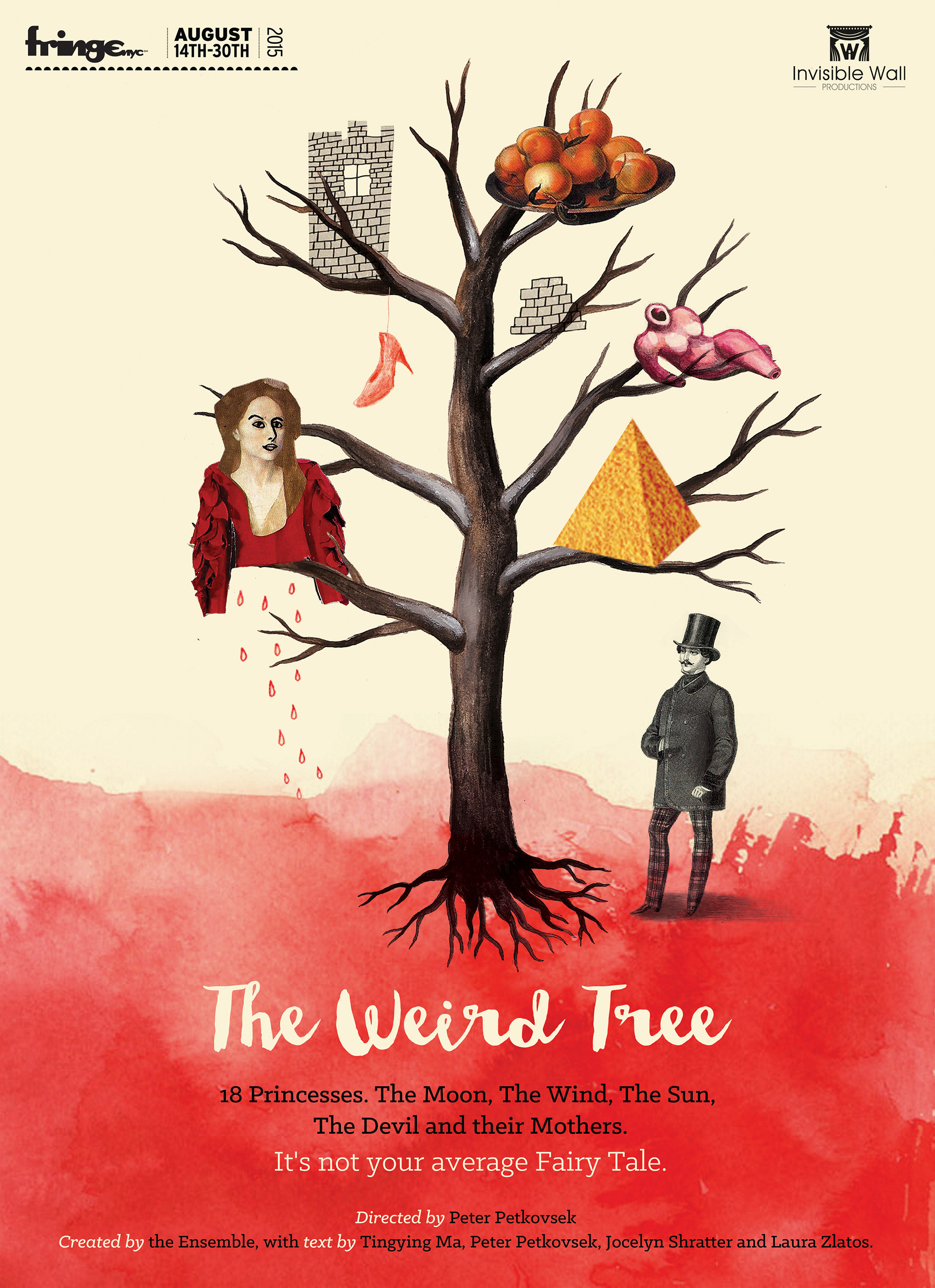 Poster for a theatre play The Weird Tree, presented as a part of the New York International Fringe Festival. A Man climbs a tree to win a Princess. Instead he finds eighteen. Based on a Slovenian Fairy Tale, The Weird Tree is a spiritual journey where making sense of the world means diving deep into the subconscious and figuring out the Self first. The Weird Tree was originally produced at the Studio Theatre at Columbia University in 2013.